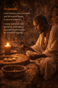 Orunmila does exactly as instructed. He keeps the kolanuts unsplit even when many others come forward. This obedience preserves the story’s outcome.