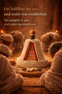 The story also teaches that cleansing and preparation are part of installation. ORI is not simply allowed to act at once. He is washed, carried, and placed at the shrine before the decisive moment. Sacred elevation is shown as something that must be prepared.
