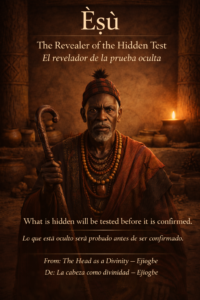 Esu announces the challenge and later announces the outcome. His function is to expose what is hidden and make it visible in the public field. He serves as the force through which destiny is tested and later confirmed.